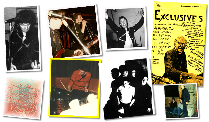 After a great deal of discussion and hair-tearing, the alternative decided upon was the Exclusives. Shortly after the change of name, the Exclusives were joined by Steve (ex-Pinball) on sax and vocals. The line-up has subsequently remained unchanged. The Exclusives gigged mainly in the Brighton area, but purveyed their lunatic brand of schizoid pop to such diverse watering-holes as London, Reading and even Portsmouth.