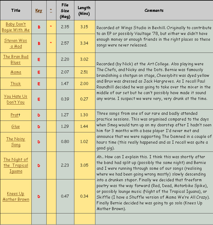 Pratt, Glue and The Noisy Song were three songs from our rare and badly attended practice sessions. This was organised compared to the days when Smeg would turn up on my doorstep after I hadn't seen him for 3 months with a bass player I'd never met and announce that we were supporting the Damned in a couple of hours time (this really happened and as I recall, was quite a good gig)